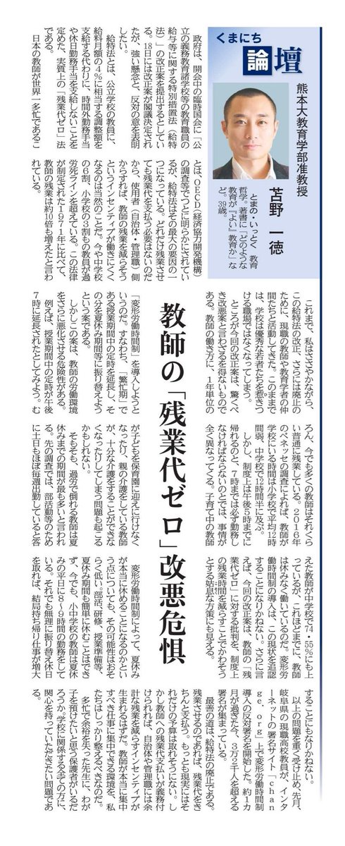 RT @ittokutomano: 先日の、熊本日日新聞での連載「くまにち論壇」。今回は、「教師の『残業代ゼロ』改悪危惧」です。現職の先生、そして教員志望の学生たちと共に、声をあげ続けたい。 pic.twitter.com/1UxX68gLWj